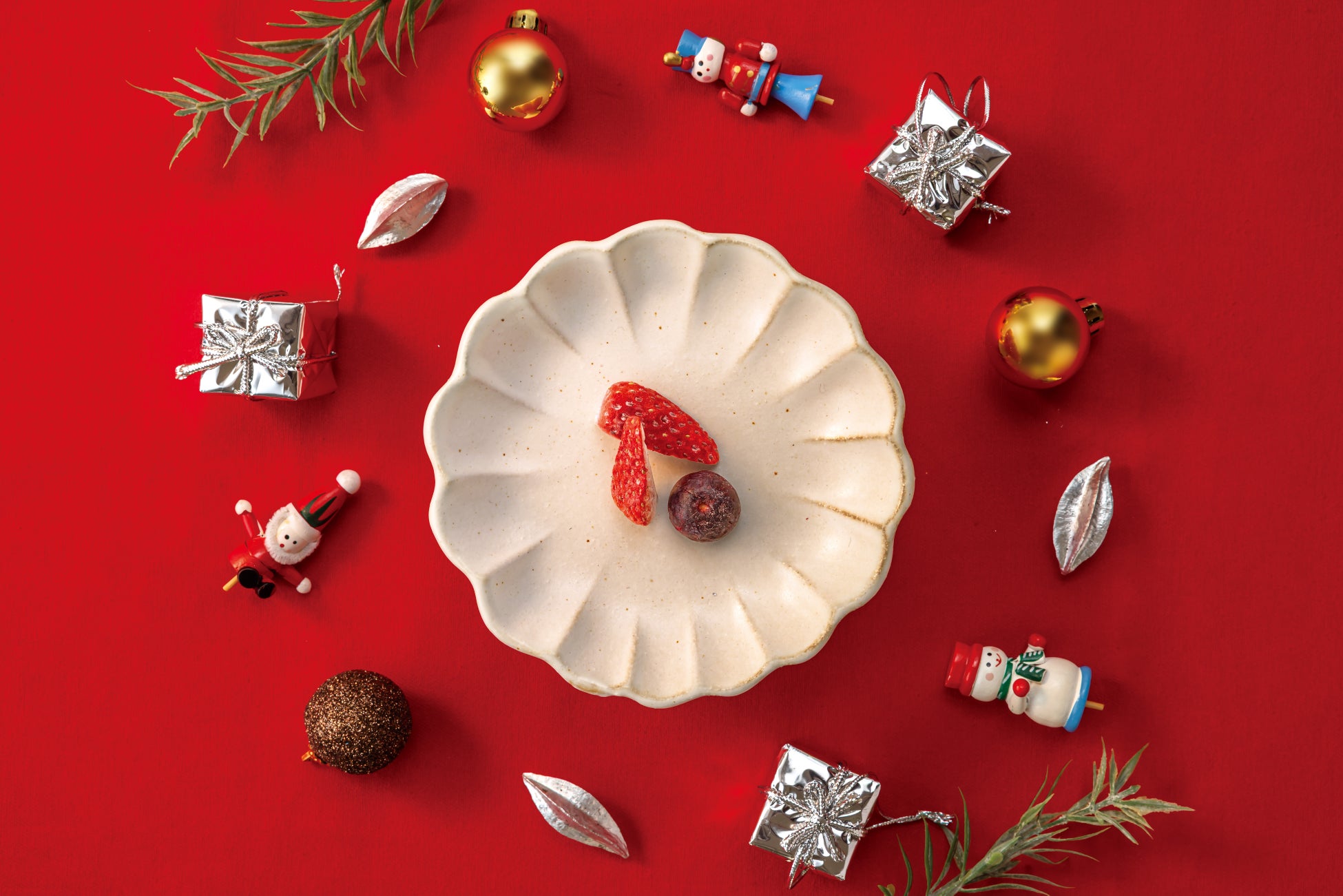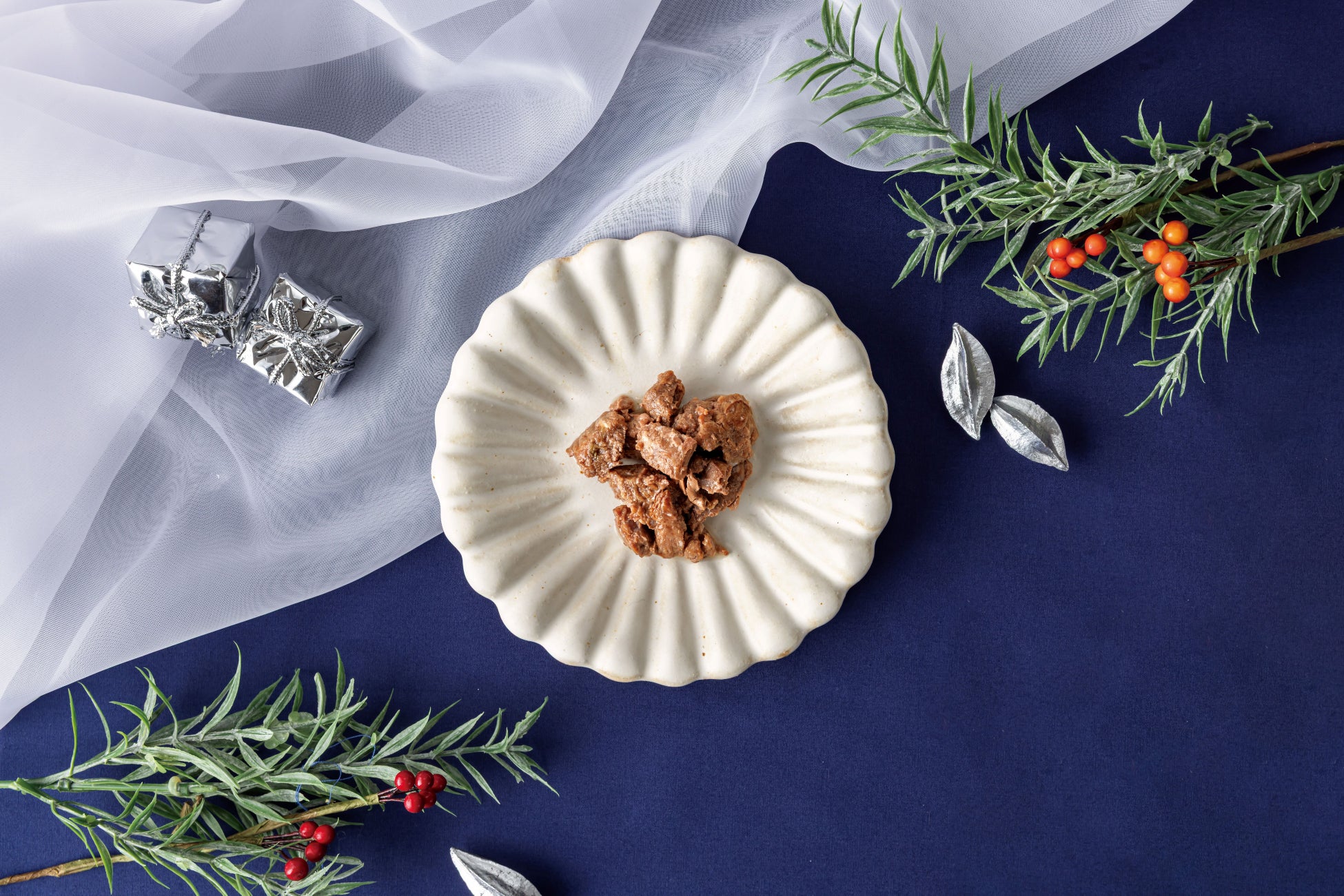 国産いちごとブルーベリーを使った、愛犬のためのクリスマスデザート。いちごはひと粒ずつ手切りし、ブルーベリーは縮まないよう一工夫を施してから、丁寧な温度調整のもと独自技術でフリーズドライしました。サクサク食感と華やかなベリーの香りが、クリスマス気分を盛り上げます。
