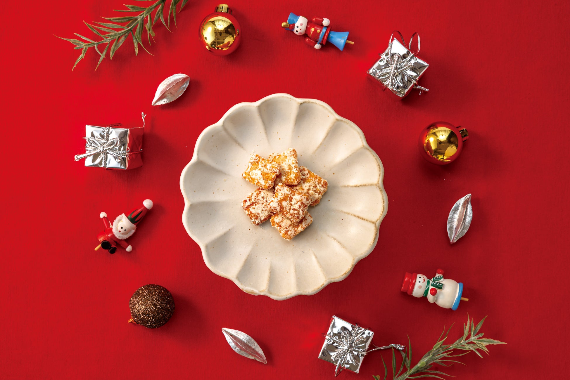 雪解け水が育んだもち米「わたぼうし」の杵つき餅を素焼きし、サクサク食感のあられに。完熟した国産いちごの果肉と果汁をたっぷりコーティングしました。赤と白のクリスマスカラーで、目にも楽しいおやつです。