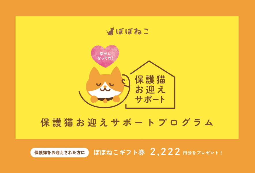 本プログラムでは、2025年10月1日以降に保護猫を正式に迎えたことを証明できる方に、ぽぽねこ公式オンラインショップで使用できる2,222円分のギフト券を、もれなくプレゼントいたします。